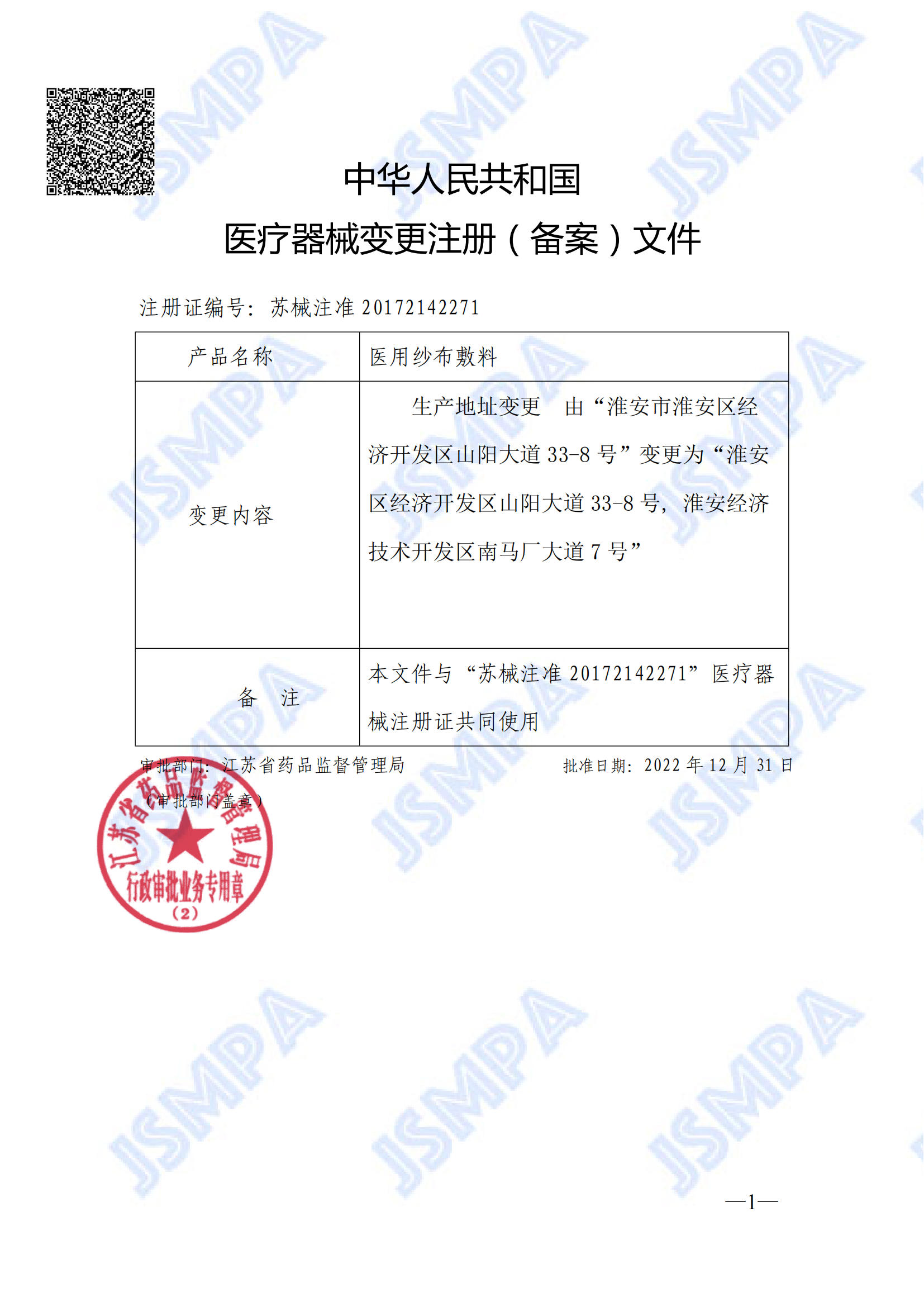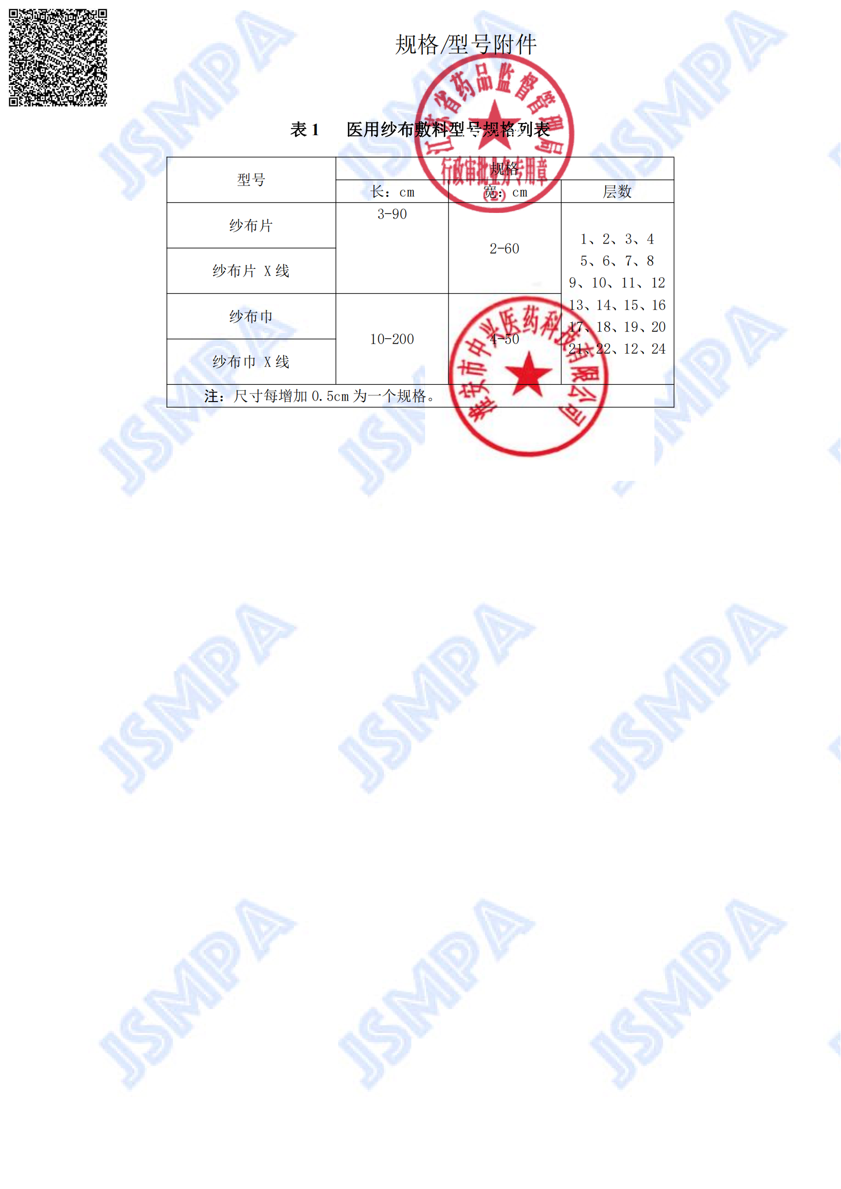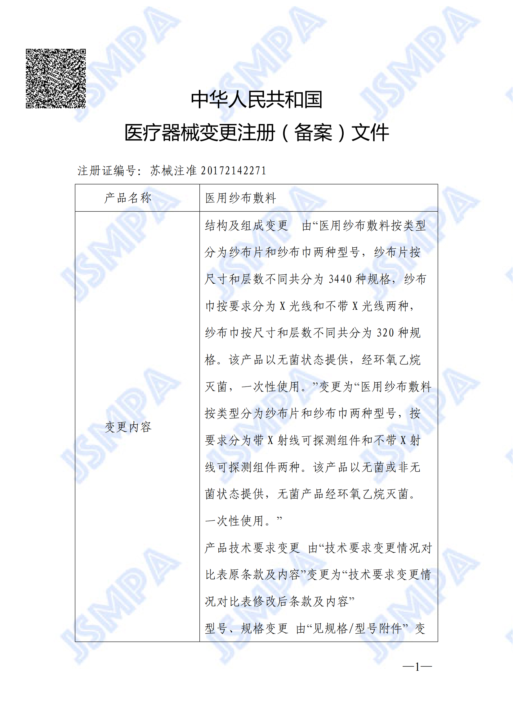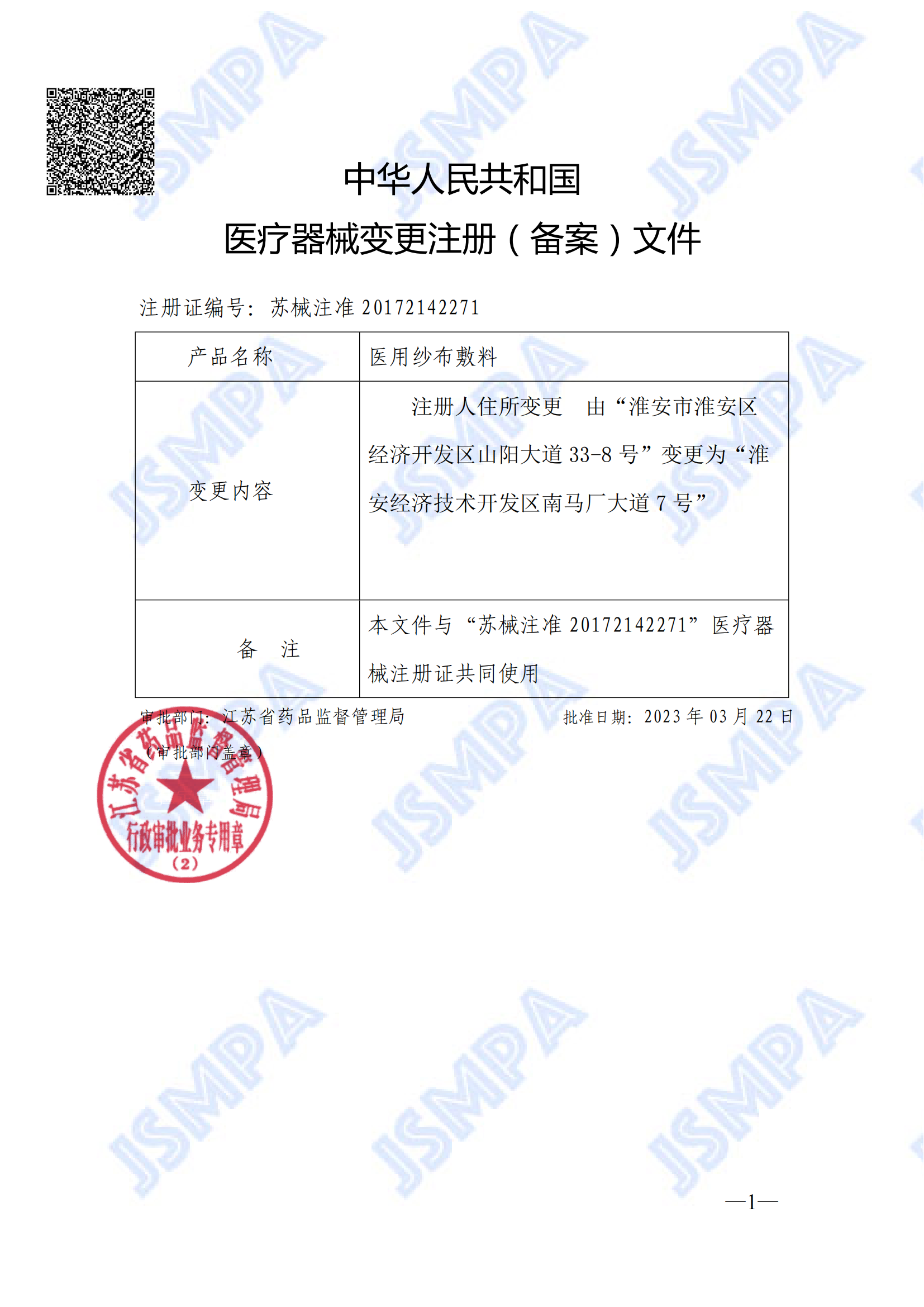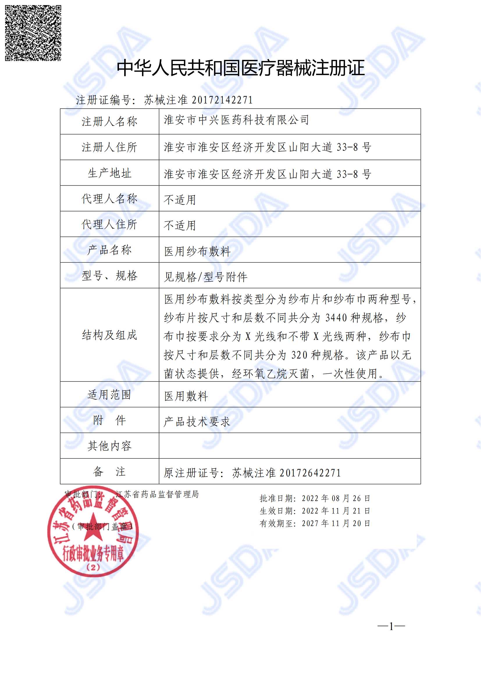 醫療器械注冊證(醫用紗布敷料注冊證)