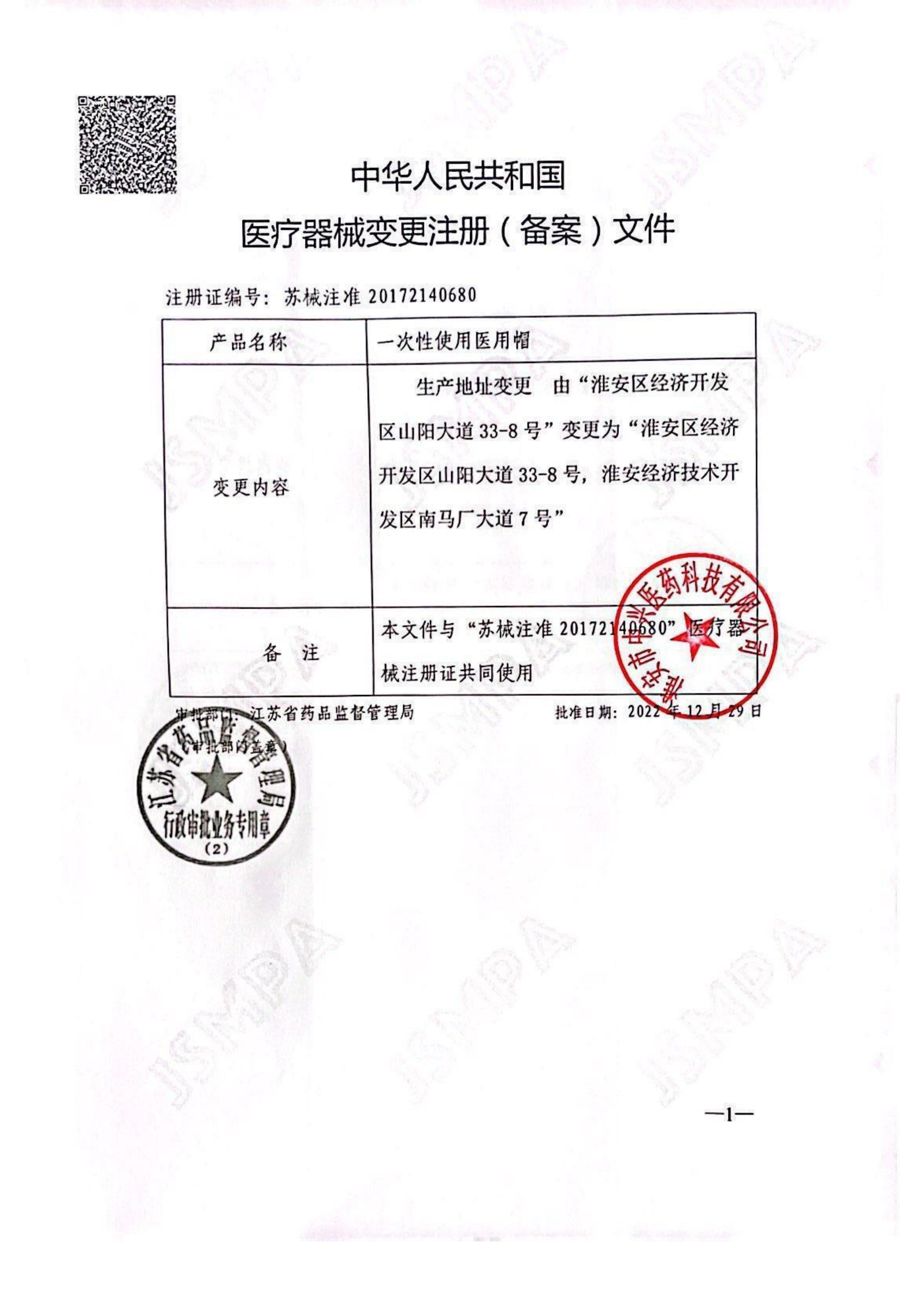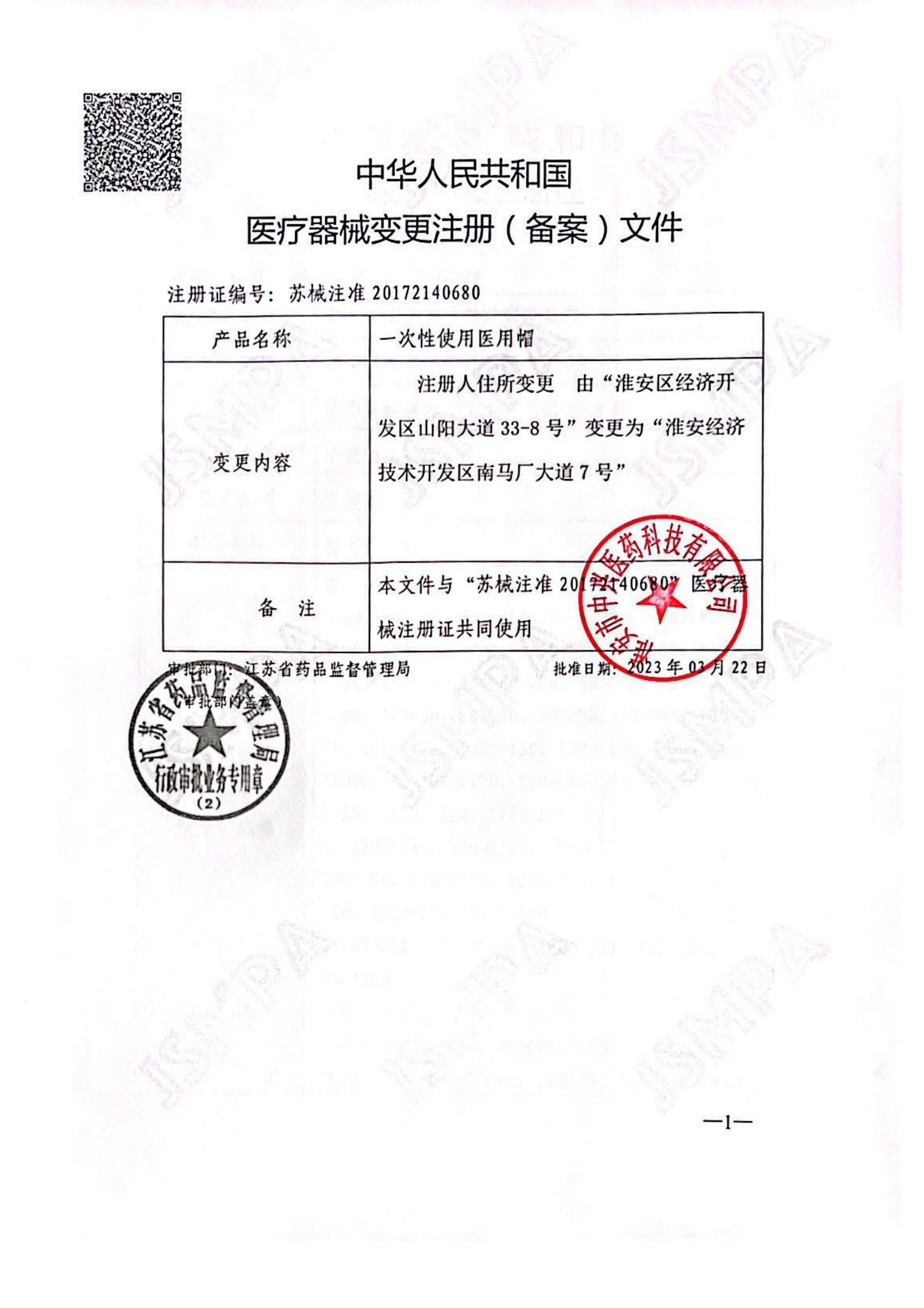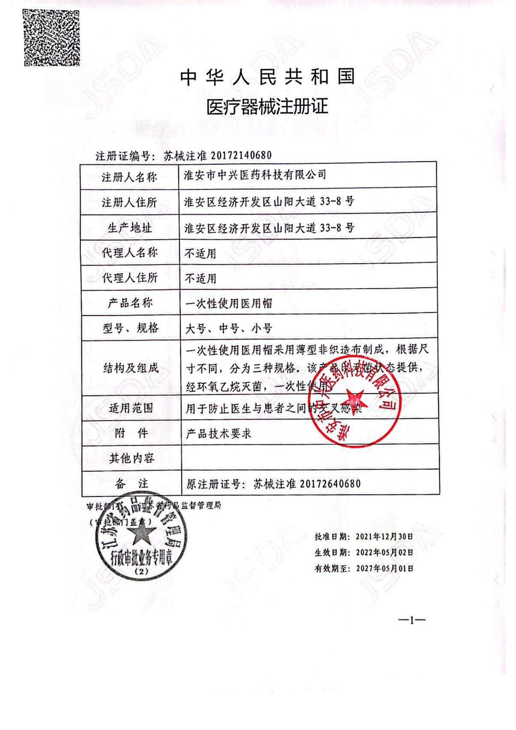 醫療器械注冊證(一次性使用醫用帽)