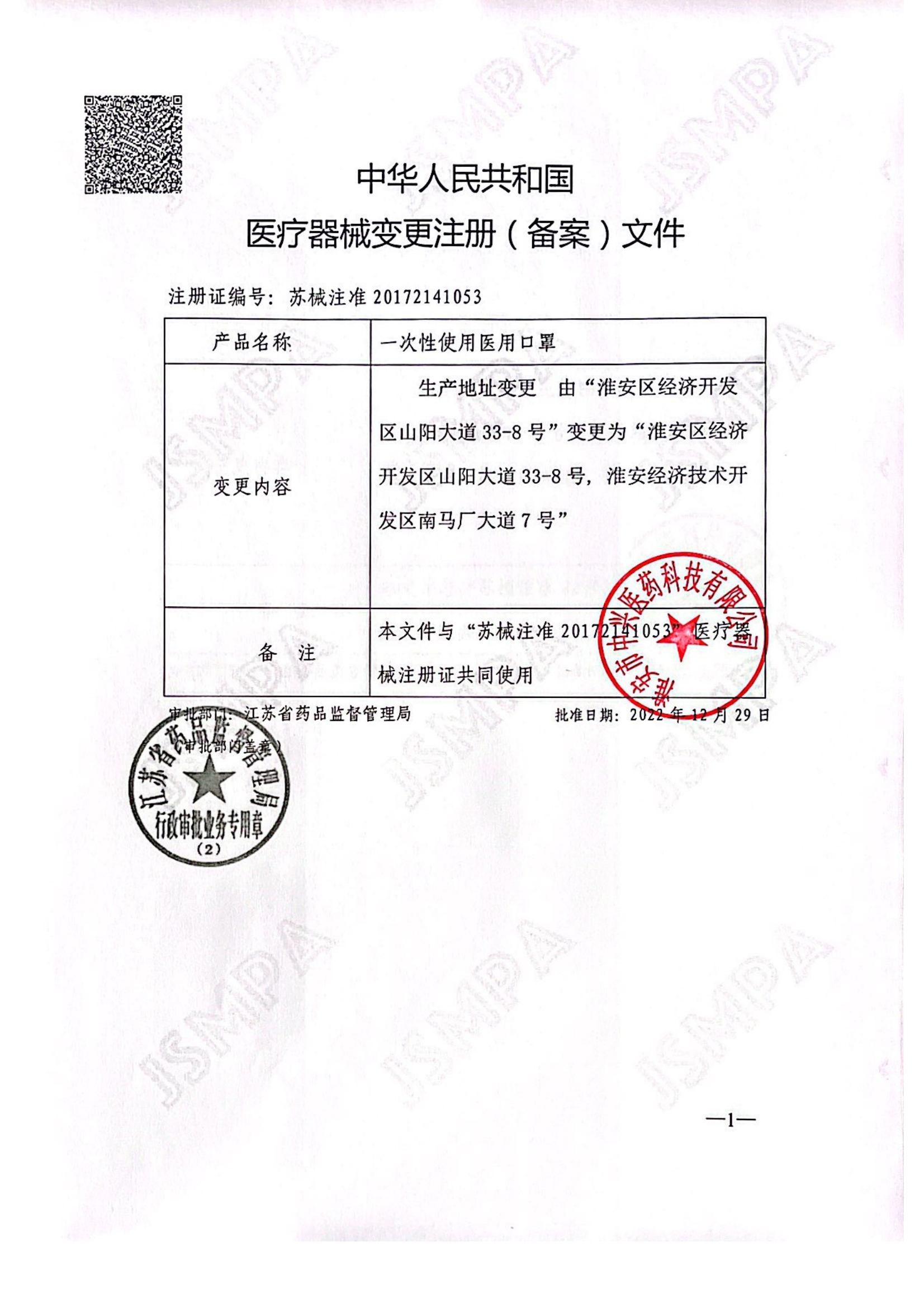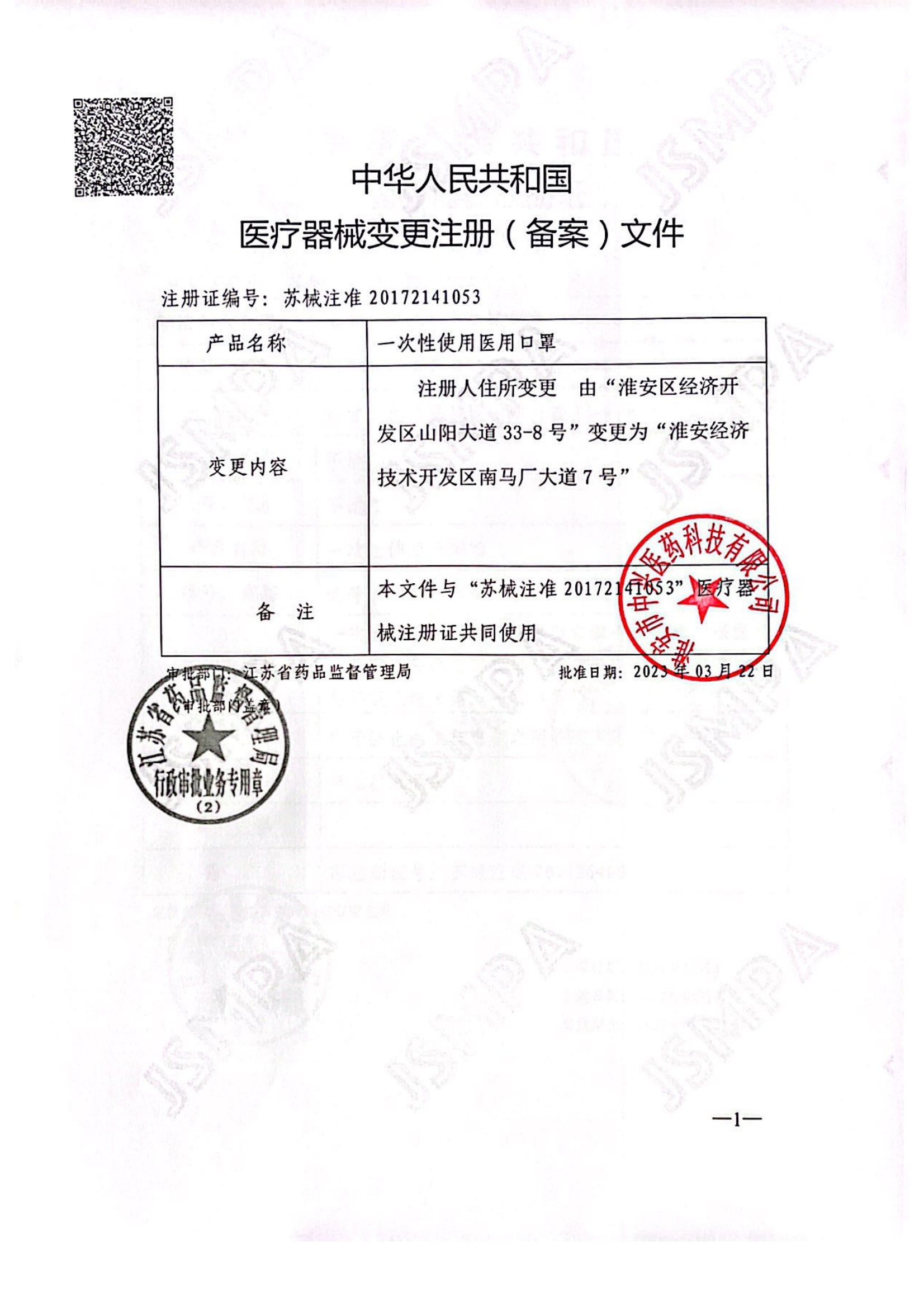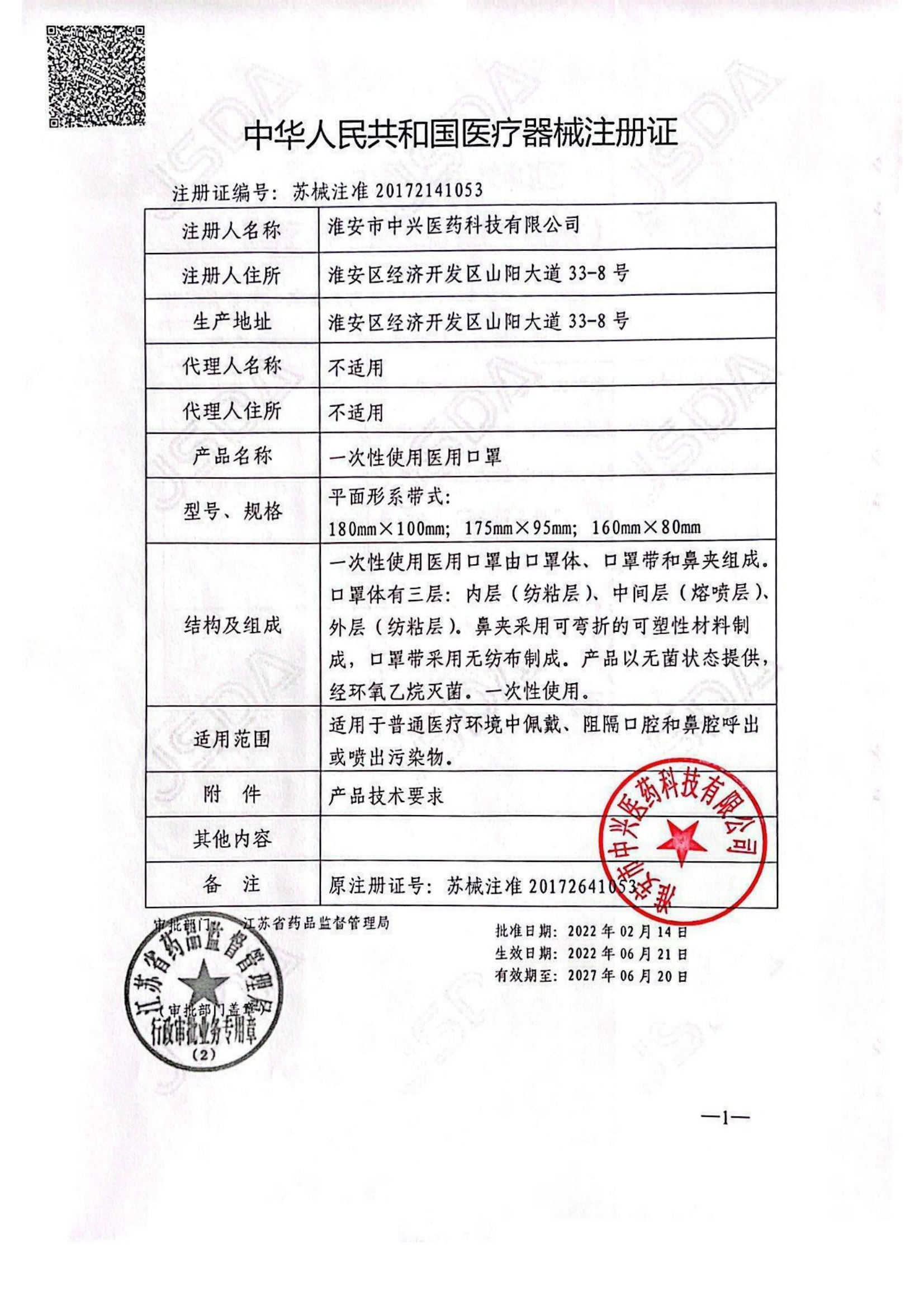 醫療器械注冊證(一次性使用醫用口罩 )